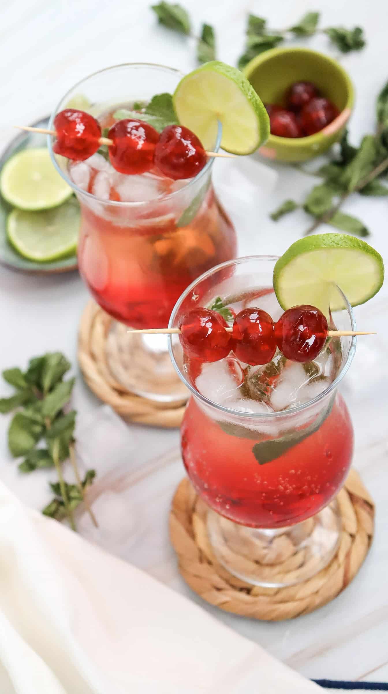 - Garnish: Top with a maraschino cherry, and if you’d like, add a lime wedge or an orange slice for extra color and flavor. You can also add a sprig of fresh mint for a festive touch.
