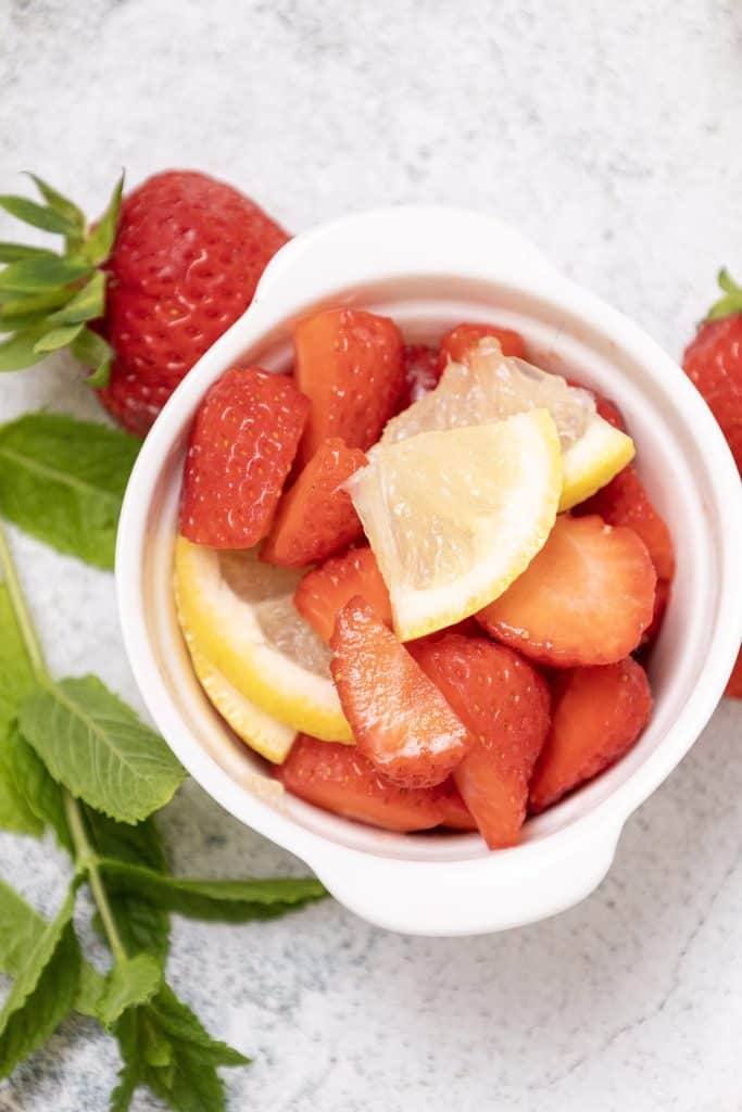 Start by slicing your strawberries and lemon. Dice the strawberries into small pieces for easy muddling, and slice the lemon into thin wedges or rounds.